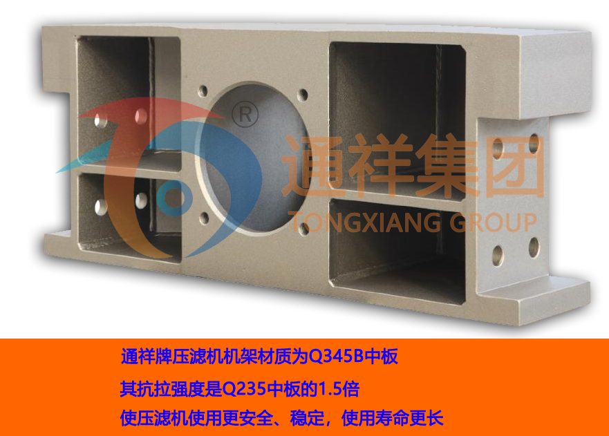 1.“通祥集團(tuán)”壓濾機(jī)機(jī)架材質(zhì)為Q345B中板,其抗拉強(qiáng)度是Q235 中板的1.5倍,使“通祥牌壓濾機(jī)”壓濾機(jī)使用更安全、穩(wěn)定,使用壽命更長。