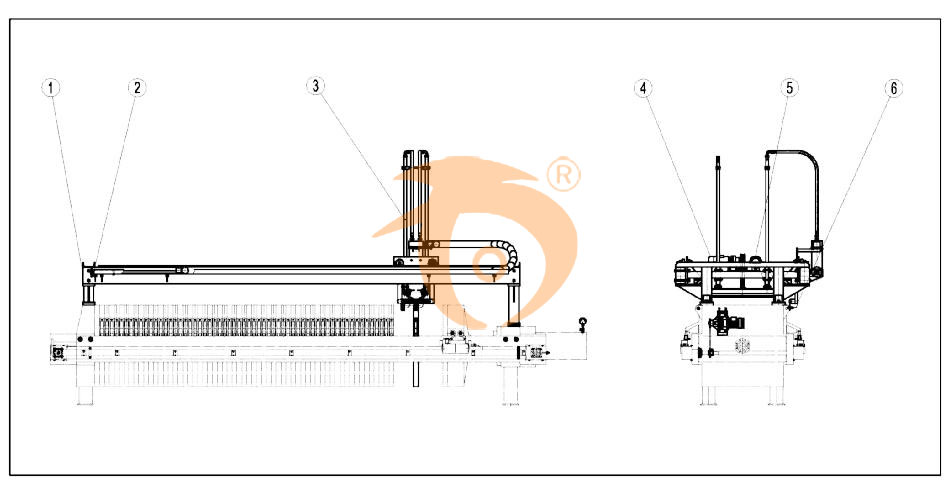 (1)拉板系統(tǒng)采用我公司與意大利迪美公司聯(lián)合研制開發(fā)的較新技術(shù)生產(chǎn),該技術(shù)在壓濾機(jī)自動(dòng)拉板系統(tǒng)中是世界上較比較先進(jìn)的。使用該拉板系統(tǒng)可優(yōu)化原有的液壓系統(tǒng),減少了原液壓系統(tǒng)的復(fù)雜換向及動(dòng)力轉(zhuǎn)換,從而減少液壓系統(tǒng)的故障率,提高了設(shè)備的運(yùn)行的可靠性。